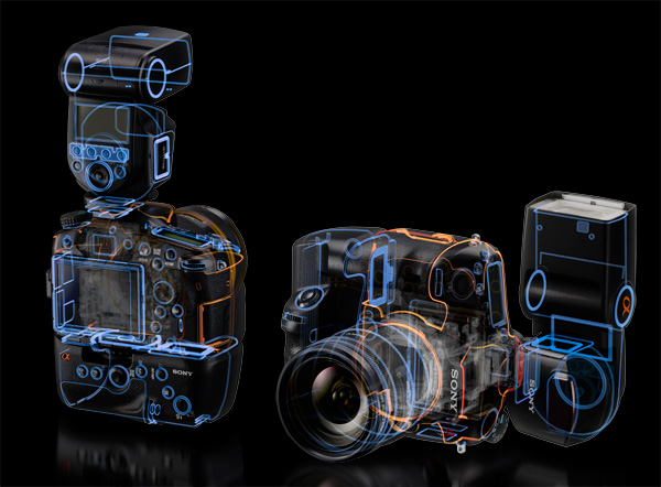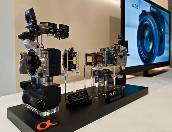 Nunca agradeceremos bastante a Sony que nos mostrase su "exploded view", o despiece en el espacio, de su A77 sin ocultarlo bajo una vitrina de metacrilato, iluminada además con violentos focos halógenos, como es costumbre en otras firmas y hace casi imposible ofrecer una fotografía digna de ese bonito montaje, que de esta manera, afortunadamente podemos ofrecer a nuestros lectores. Lo decimos en clave de humor, pero con un poso de realidad.