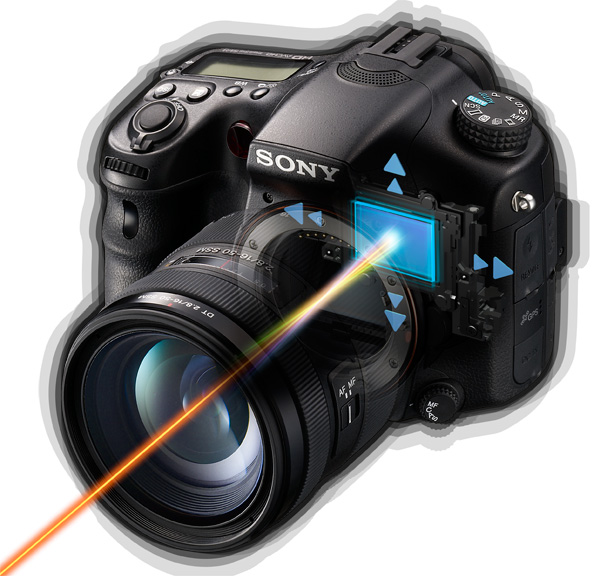 No es nuevo –ya la ofrecían las Konica-Minolta– pero la A77 incorpora la estabilización por desplazamiento del sensor, si bien no utiliza la nueva tecnología más activa, por vibración del vidrio anterior del captor anunciada para la NEX-5N como prevención contra el polvo, sino, al parecer, la de “sacudir” el captor utilizando el juego permitido por el sistema de estabilización