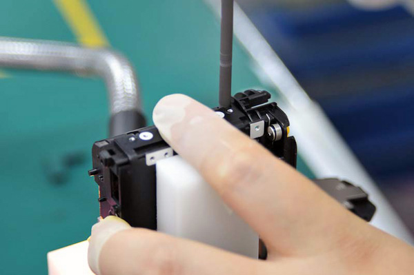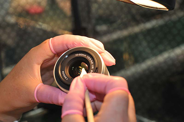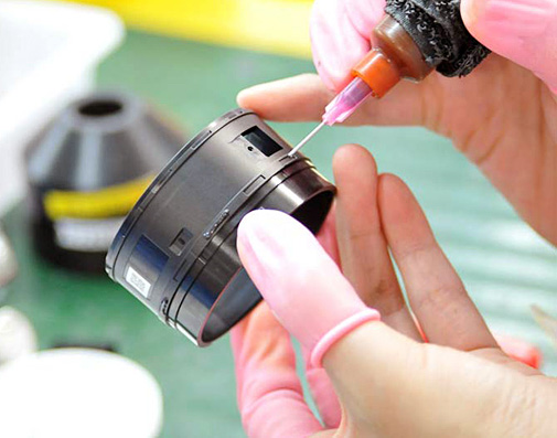 Se aplican manualmente pequeñas cantidades de lubricante en las levas para zoom. Una jeringuilla muy similar, pero cargada de pintura se emplea para los logotipos (ver más adelante).