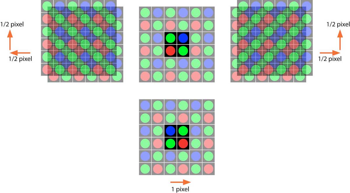 ="">El disparo multishot o multidisparo, aplicable solo a sujetos estáticos, consiste, básicamente, en desplazar entre cada una de tres tomas el sensor –mediante un sistema piezoeléctrico– el espacio equivalente a un pixel, por lo que las “capturas” se hacen por separado para cada color (RGB).