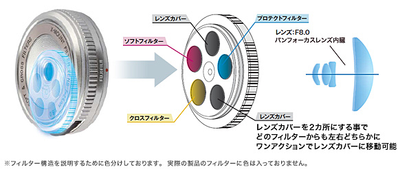 cuatro lentes para un resultado de un 24 mm f/8 (equiv. a 36 mm) y ofrece "panfocus" de un metro a infinito.