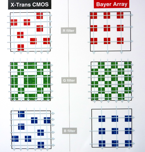 Como ya publicamos, Fujifilm propone una tipología nueva de captor al eliminar el filtro de paso bajo y ubicar el filtraje cromático de las fotocélulas aleatoriamente de manera tal que este grado de aletoriedad, sumado al suficiente número de elementos solvente de un plumazo los posibles problemas de moirè presentes en la imagen.