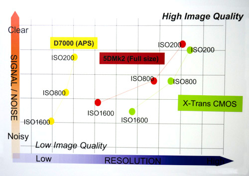 Nos ha impresionado especialmente el grado de transparencia y sinceridad con la que el equipo de ingenieros y responsables de Fujifilm, mayoritariamente japoneses, aseveran la alta calidad de este captor, llegando incluso - sin tapujos y a las claras - a compararlo con los altuales equipos de referencia profesional para las dos marcas Réflex principales, ahí es nada...
