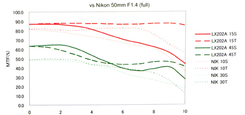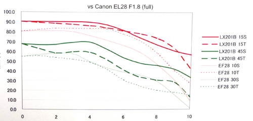 Atendiendo al esquema superior podemos observar que para esos supuestos zoom ninguno baja de f/4, no siendo menos de f/2.8 para las ópticas fijas, a todas luces una apuesta profesional, por objetivos de alta luminosidad y alto rendimiento, del cual hablan algo sus tablas MTF, publicadas más abajo nuevamente en directa competencia con otros objetivos míticos y de referencia.