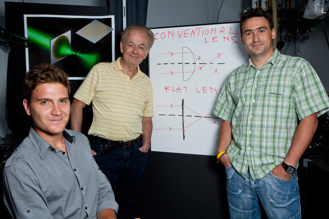 Pues bien, las lentes de “metasuperficie” creadas en SEAS, ofrecen corrección aprocromática en una lente plana, de espesor mínimo. Imagen © Patrice Genevet, Federico Capasso y Francesco Aieta, Harvard SEAS
