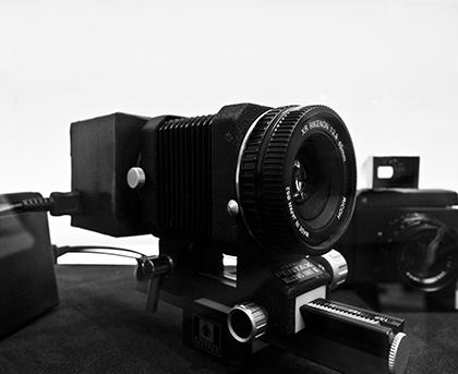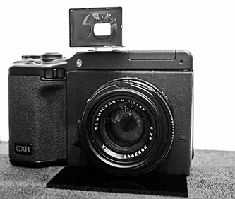 En otro módulo más, el acoplamiento es -en el fondo- más convencional si se puede emplear la palabra, algo que se semeja más a los montajes que hacíamos en los años 70... un cruce entre un objetivo para cámara réflex de 35 mm, con un módulo GXR vía un fuelle...