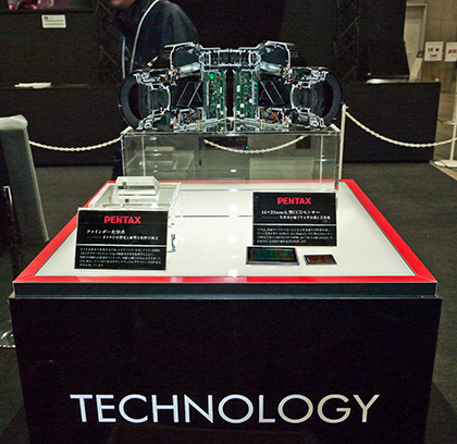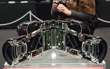 Los creadores de la Pentax 645D parecen muy orgullosos, y con razón, acerca del diseño y construcción de la cámara, y acorde con ello, en el estand se exhiben cortes, procesadores, prismas, chasis y subchasis, y toda clase de despieces. Desde luego esta Pentax 645D no es ninguna chapuza ni producto obsoleto aggiornado, sino de finalización muy actual.