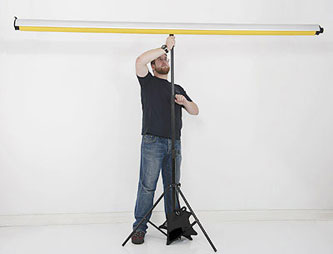 Puestos a trabajar en el estudio, el nuevo sistema de portafondos “EzyRoll” de la conocida firma Colorama, ofrece la ventaja de poder ser operado de forma segura por una sola persona, tanto en instalación de pared, en estudio, como en soporte de pie, en localización.