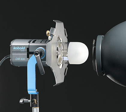 Ahora Broncolor ofrece un adaptador que permite utilizar una gran parte de los reflectores moduladores de luz sobre las fuentes de luz continua Kobold DW 200 y DW 400, facilitando lo que se viene en llamar el “crossover” entre unos medios y otros.