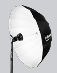 La Umbrella XL tiene una forma ligeramente parabólica, para que la distribución de la luz pueda ser modificada simplemente al deslizar vástago en la antorcha. Además, la dispersión de la luz puede ajustarse moviendo el Zoom Reflector adelante y atrás. Ofrece en todo caso una gran fuente de luz suave, siendo fácil de transportar.