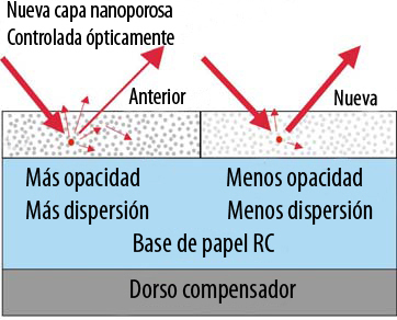 La capa nanoporosa controlada ópticamente, ofrece menos dispersión de la luz y una más baja opacidad, al tiempo que controla de forma muy avanzada la finación de las tintas.