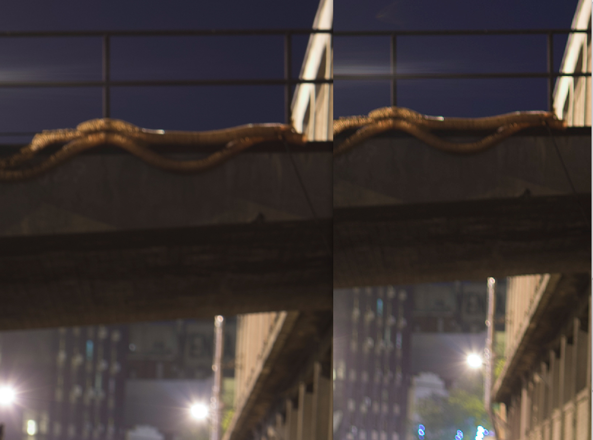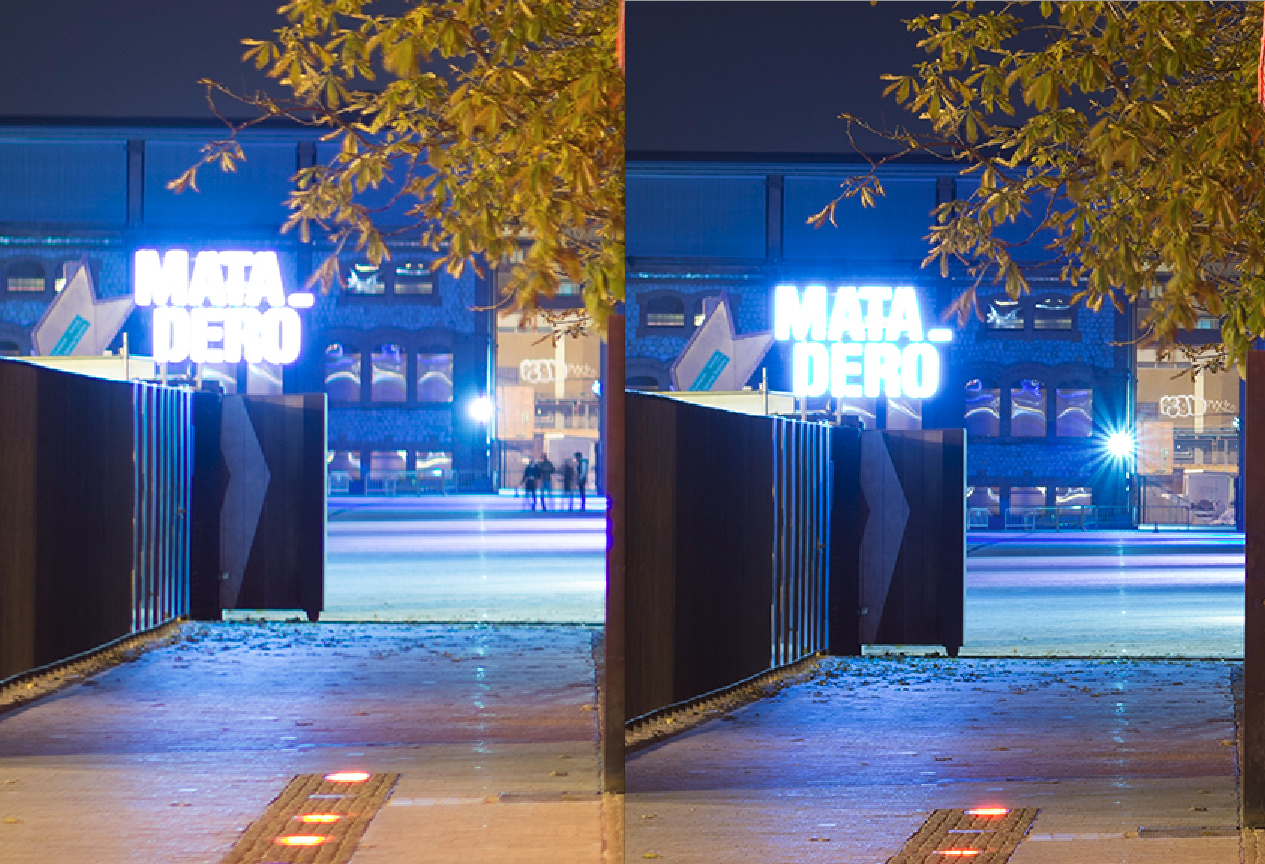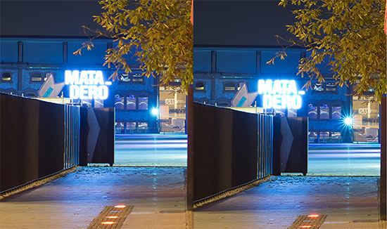 Zeiss Otus 55 mm f/1,4, enfocado a "Matadero", a f/1,4 (izda.) y a f/5,6 (dcha.)