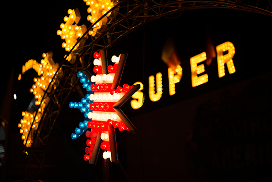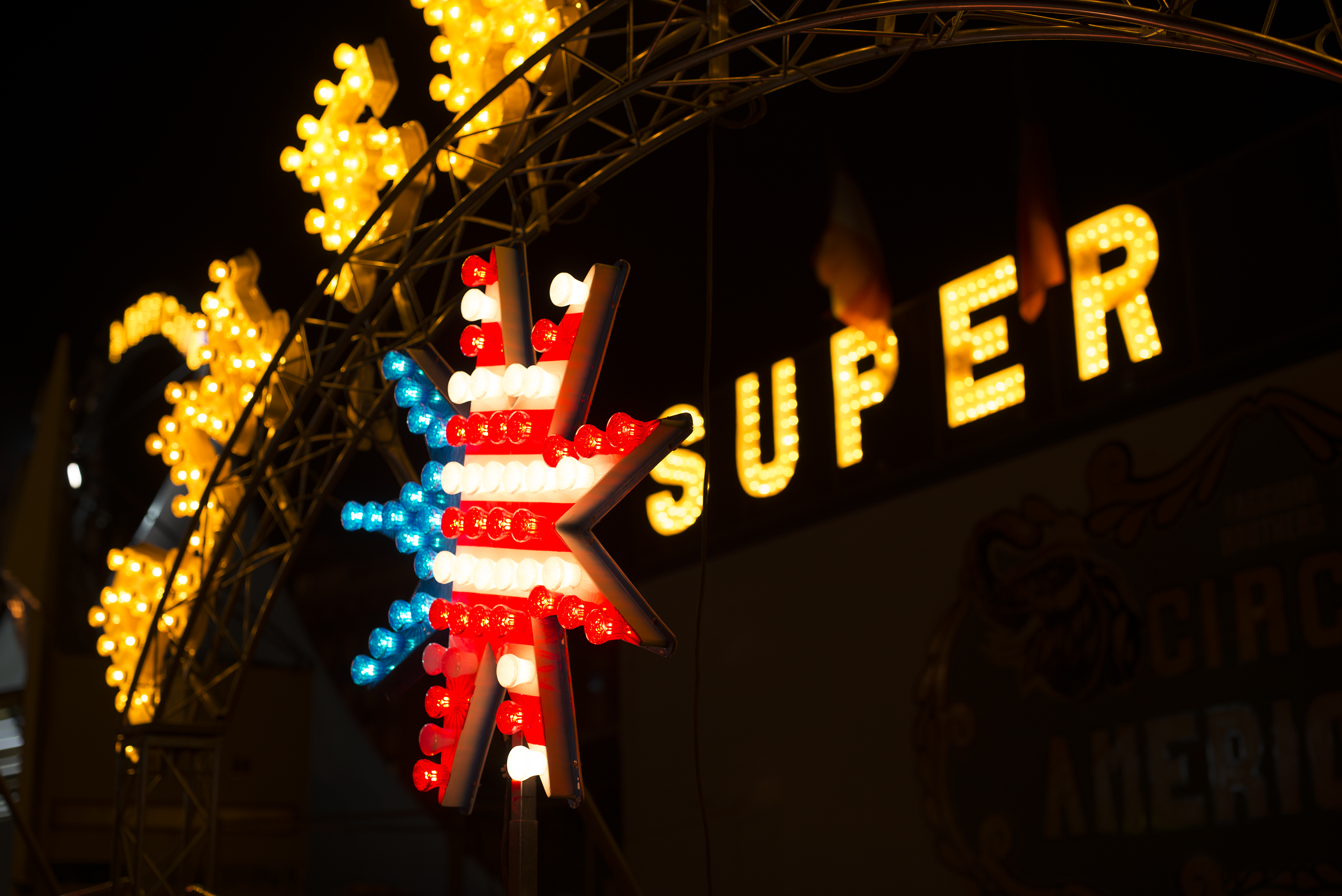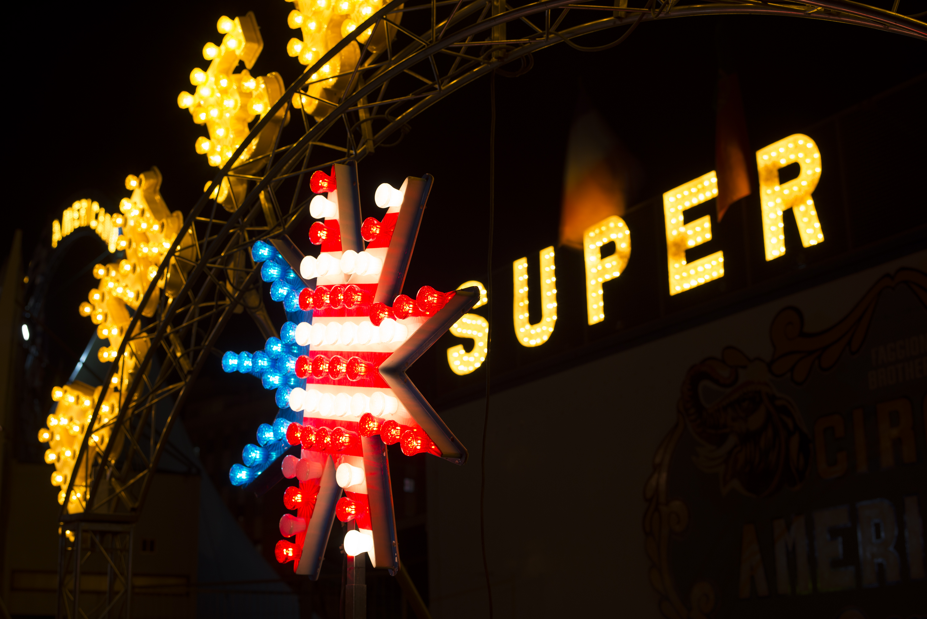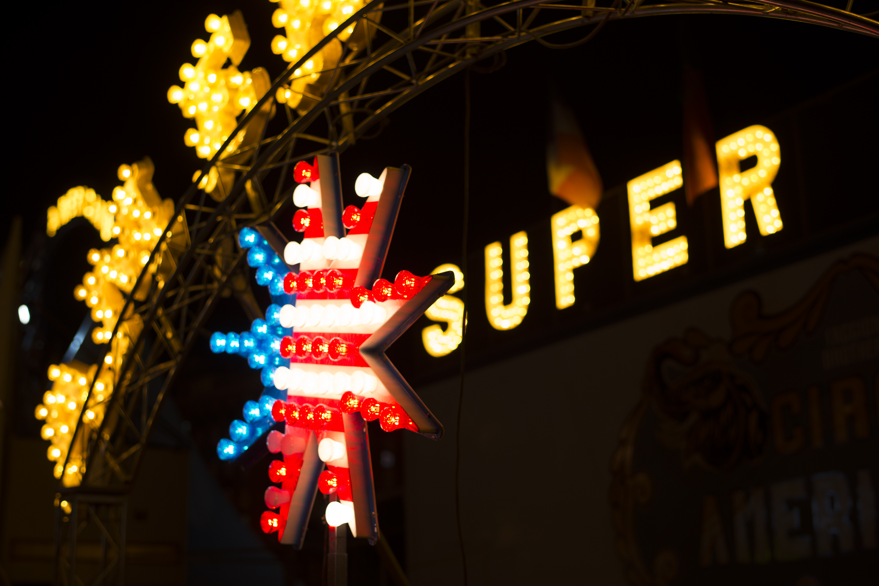 Para la primera toma, hemos elegido un llamativo letrero iluminado, del conocido "Circo Americano". El foco está puesto en las bombilas rojas más próximas.
