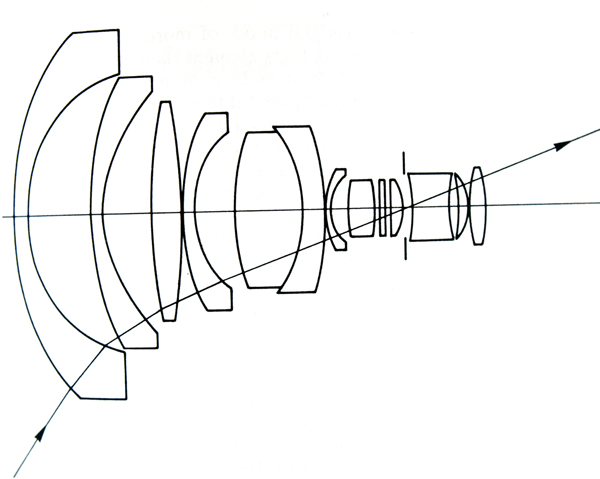 Diseño óptico fuertemente asimétrico, del tipo retrofoco. Carl Zeiss Flektogon 20 mm f/4 para Kine Exakta