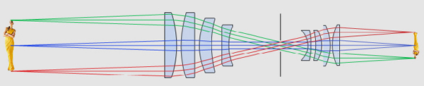 - Un objetivo compuesto por varias lentes, pero de configuración simétrica (idénticas en curvas, grosores, clases de vidrio, etc.) en torno al diafragma, situado en su centro, estaría igualmente libre de distorsión.